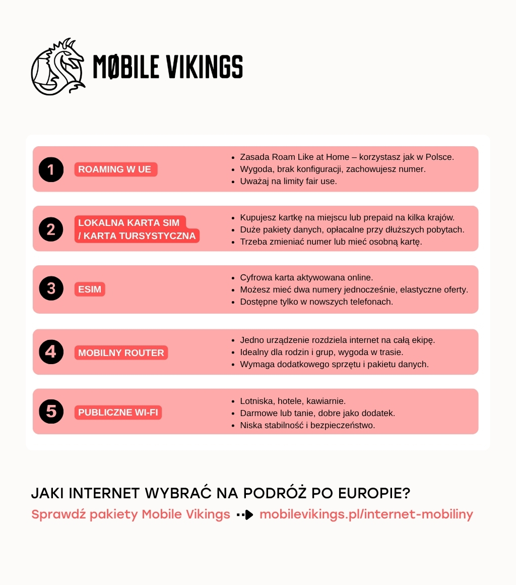 Czasem w podróż po Europie rusza cała załoga. Wtedy opłaca się wziąć mobilny router – jedno urządzenie, które rozdziela internet komórkowy na kilka telefonów czy laptopów. To dobre rozwiązanie np. dla rodzin lub ekip pracujących zdalnie w trasie. Z kolei korzystanie z publicznego Wi-Fi (lotniska, hotele, kawiarnie) jest wygodne, ale nie zawsze bezpieczne i stabilne. Słowo Vikinga, że lepiej traktować to jako dodatek niż główne źródło internetu.
